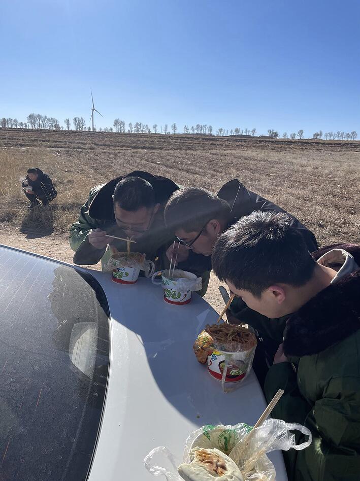 在風(fēng)場(chǎng)值班時(shí),一日三餐只能是泡面、自熱米飯這類速食品。為方便下班的同事吃飯、保證飲食安全,大家在住宿賓館附近選擇一家小餐館,作為值班回來(lái)就餐的“定點(diǎn)食堂”。接上完成交接班的同事們,我們一起去體驗(yàn)了“食堂”。晚餐過(guò)程中,大家說(shuō)說(shuō)笑笑,精神狀態(tài)很不錯(cuò),完全看不出已經(jīng)在風(fēng)場(chǎng)風(fēng)餐露宿了兩周多時(shí)間。